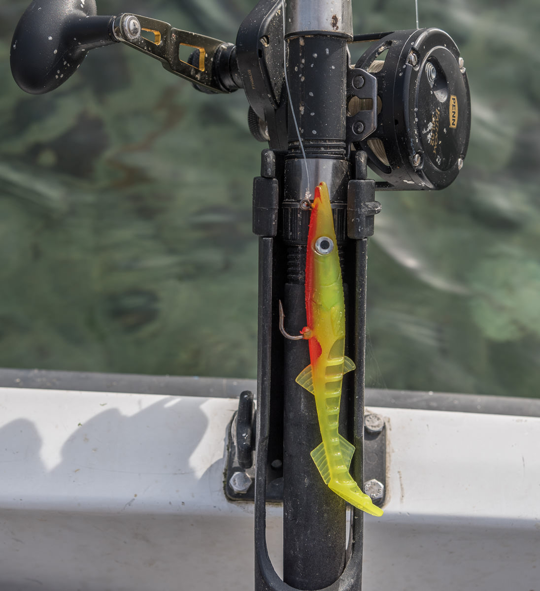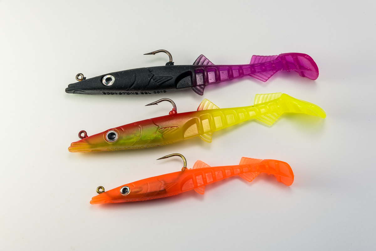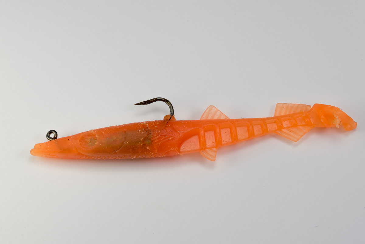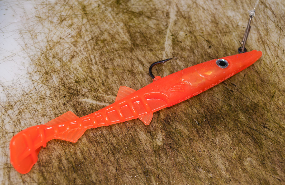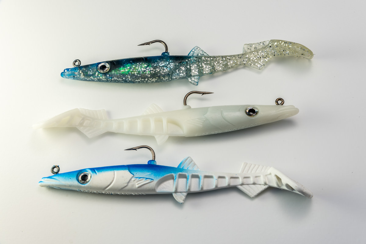 Despite the comparative inflexibility of the durable plastic the eel has an erratic, enticing great tail action which sends out tremendous vibrations at even low retrieve speeds. As well as a substantial paddle tail the rear of the body features ribbed flutes and fins which assist in the production of fish attracting vibrations. The hook and “leadhead” are encased in a head which replicates that of the natural sandeel. The placement of the hook point on the top of the body reduces the number of hook ups on rocks and seaweed.